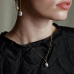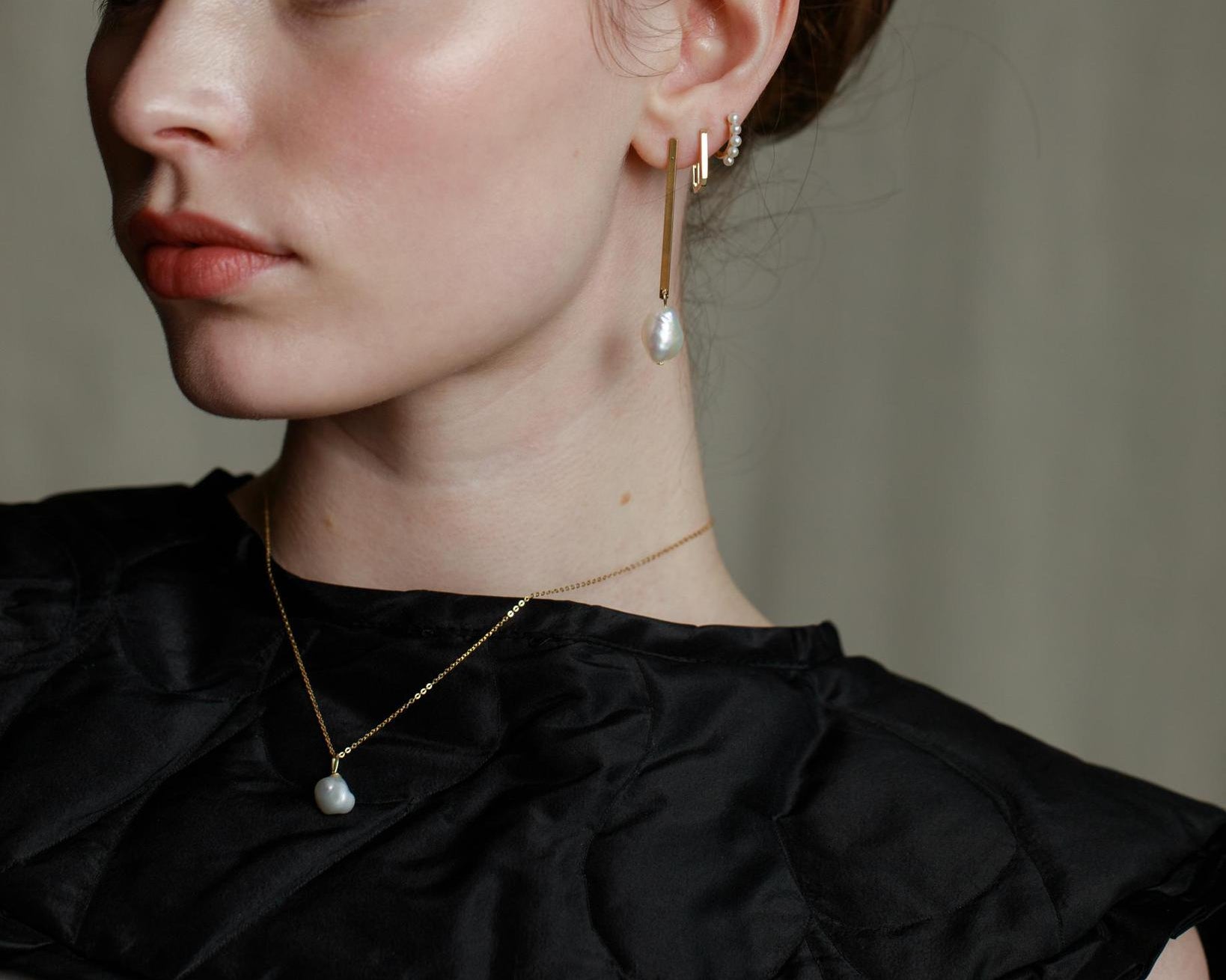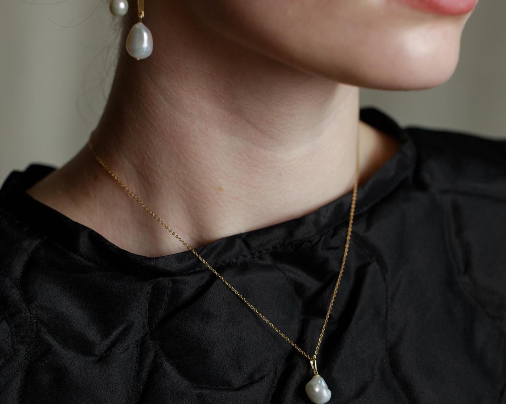 Nothing says timeless like a pearl pendant necklace. This simple and elegant design features a single baroque pearl on a nine karat yellow gold chain. Perfect for dressing up or down. Pairs pefectly with our other baroque pearl pieces, like bracelets, earrings and necklaces. Designed in Dublin and hallmarked in Assay Office, Dublin Castle.