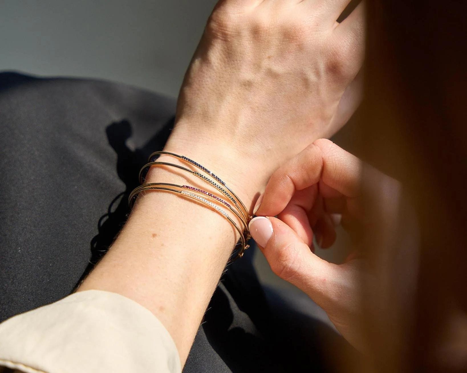 A classic style that you'll reach for again and again. Nine karat yellow gold bangle with multiple natural diamonds. The bangle is secured by a figure-eight clasp. Designed in Dublin and hallmarked in Assay Office, Dublin Castle.