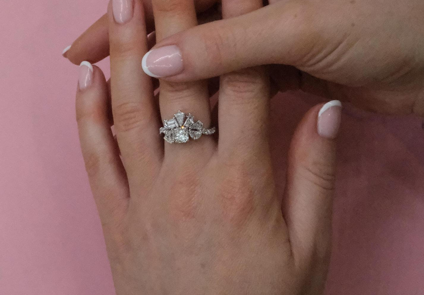 This striking white gold ring is a modern work of art, defined by its asymmetric, abstract design. The band flows in a graceful wave-like form, curving organically around the finger rather than following a straight path. At its centre, a cluster of diamonds in varying cuts and sizes creates a sparkling focal point, each stone reflecting light differently, adding depth and brilliance. An unconventional beauty.