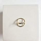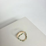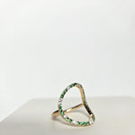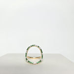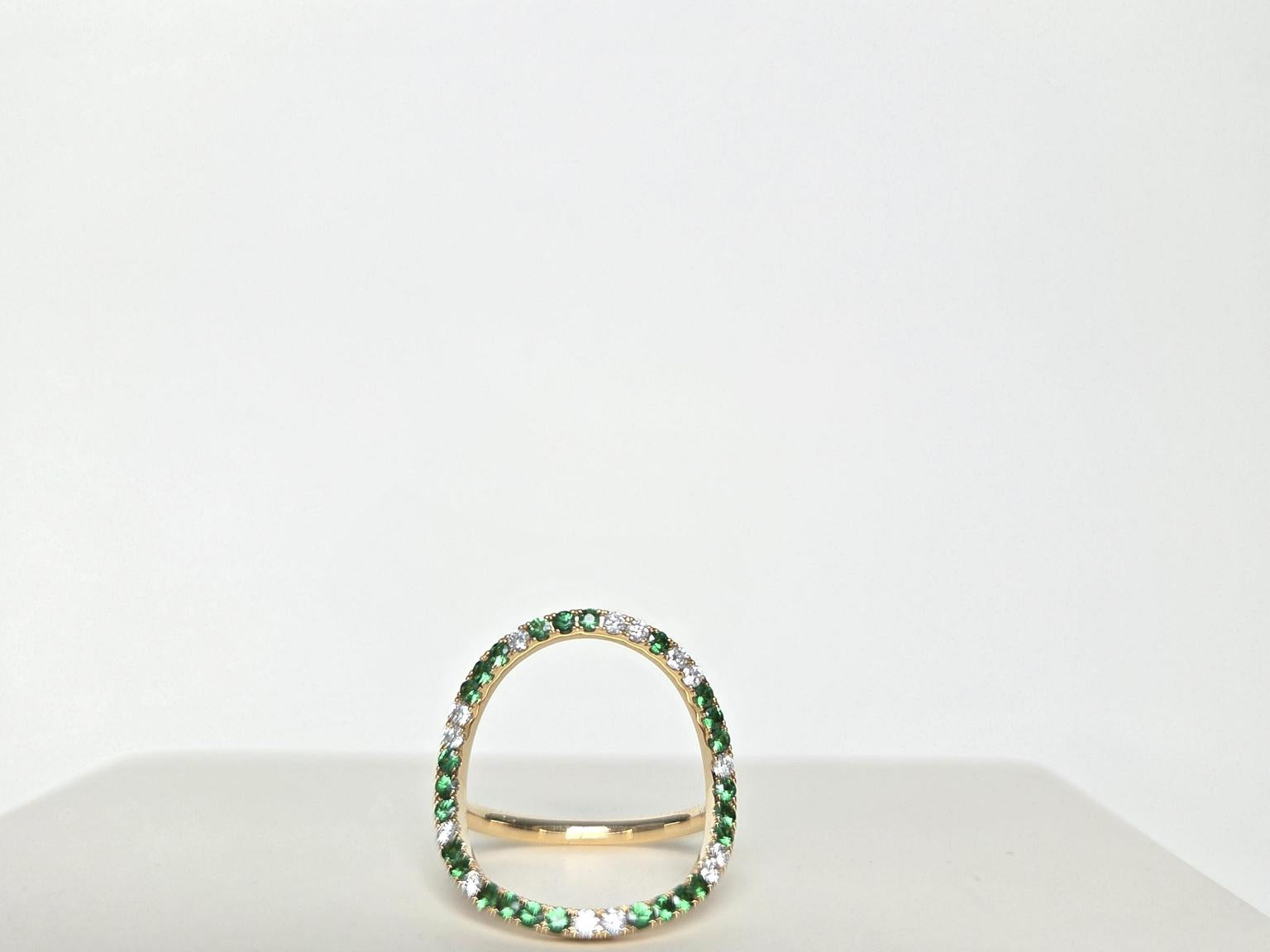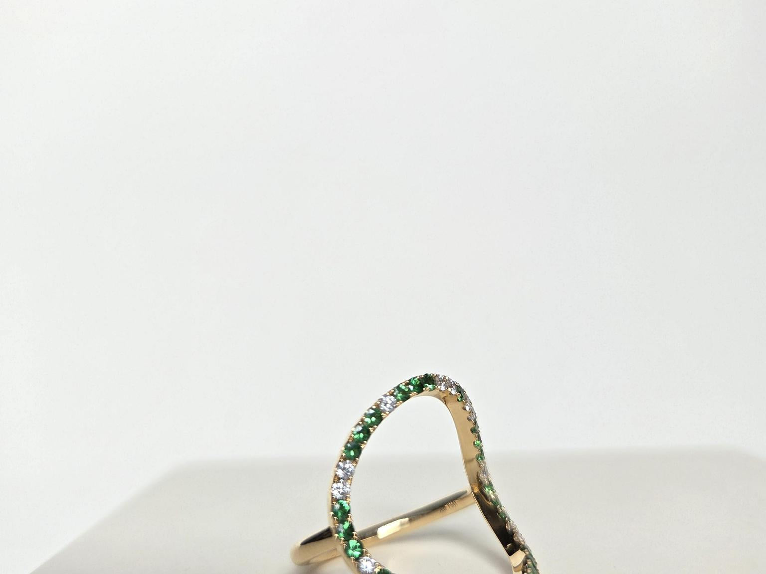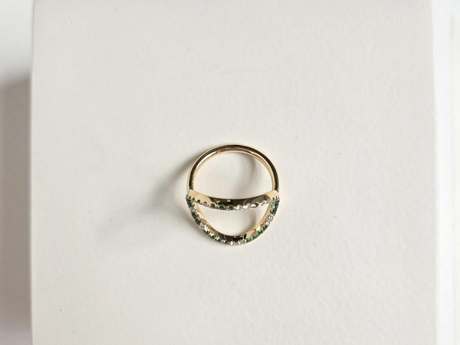 Our 'Serendipity' ring is a celebration of MoMuse and our fifteen-year Anniversary. Featuring a bold circle motif of natural white diamonds and green tsavorites set elegantly across the finger in 18kt yellow gold. Serendipity is intended as a nod to one's good fortune, opportunity, timing and triumphs - a bright reminder of life's joy and continuity.