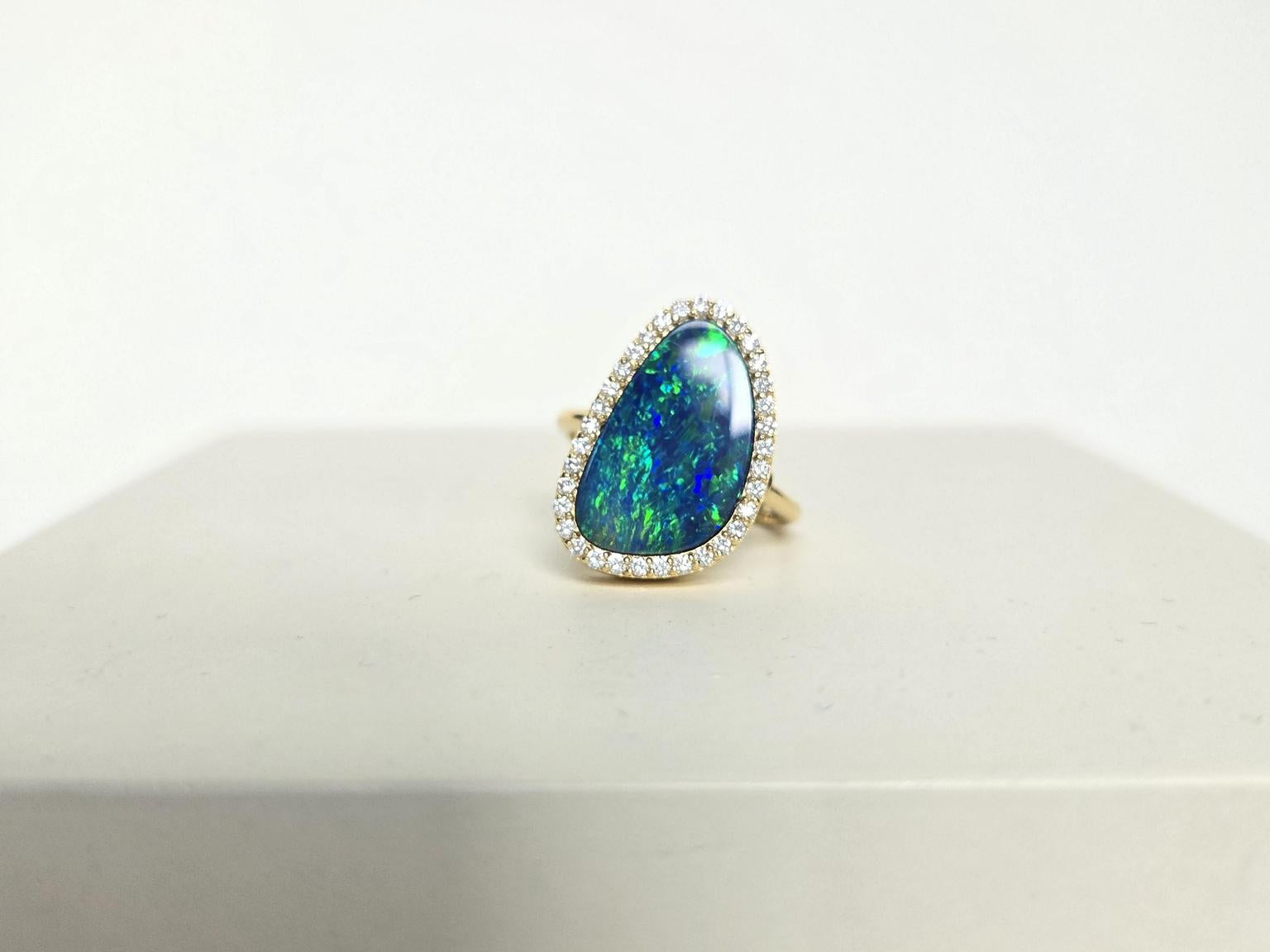 Each facet of the opal reveals shifting tones: blues, greens, and fiery flashes mirroring the unpredictable beauty of the night sky. VS-Clarity diamonds frame the stone with subtle sparkle, a radiant frame to this dazzling stone.