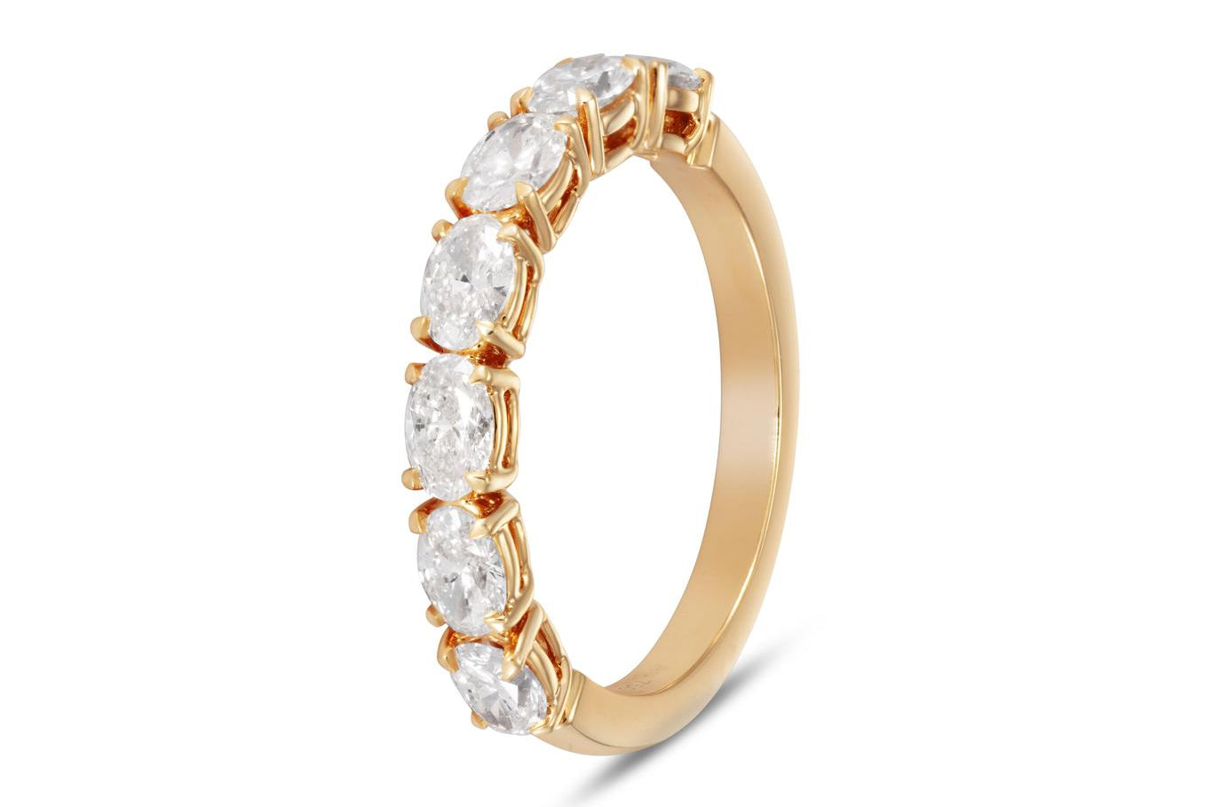 Elegant and contemporary, this Oval Diamond East-to-West Half Eternity Ring from our Signature Collection reimagines a timeless classic with modern artistry. Crafted in rich 18kt yellow gold, it features a series of oval-cut natural white diamonds, each set horizontally to follow the curve of the band. This distinctive east-to-west setting enhances the brilliance of every stone, creating a continuous flow of light and sparkle across the finger.